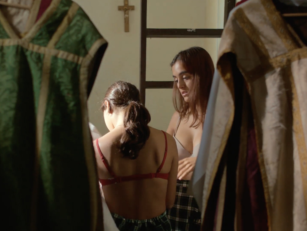 Beatriz is about to perform a solo in the choir of her catholic school. As she changes her oufit, she realizes that her shirt is too tight and as a result her precociously developed body stands out.